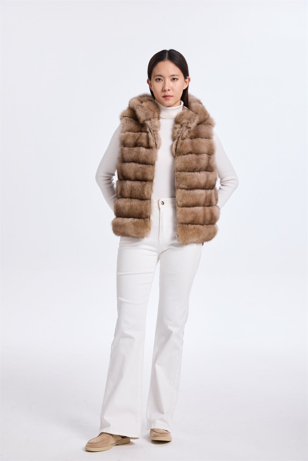 BLACK PADDING VEST WITH L.H MINK TRIMMING